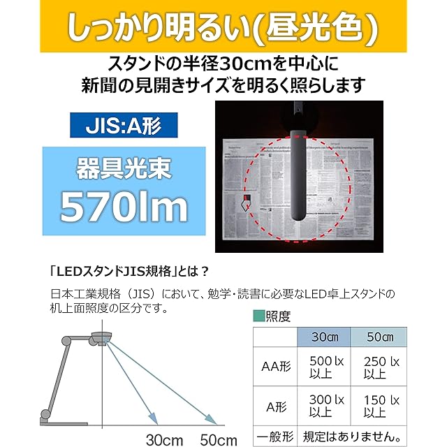 JIS:A形相当の明るさで、新聞見開きサイズを明るく照らす