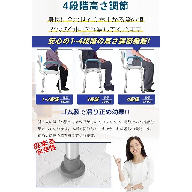 【安定性デザイン】足先がゴム製ですので、すべり止め効果抜群、水ある地面でも安定に利用できます。座面の両側には手すりのデザインがあります。使用者が手すりを把握しやすいで、安全、安心です。高齢者、妊娠中の女性など使えます