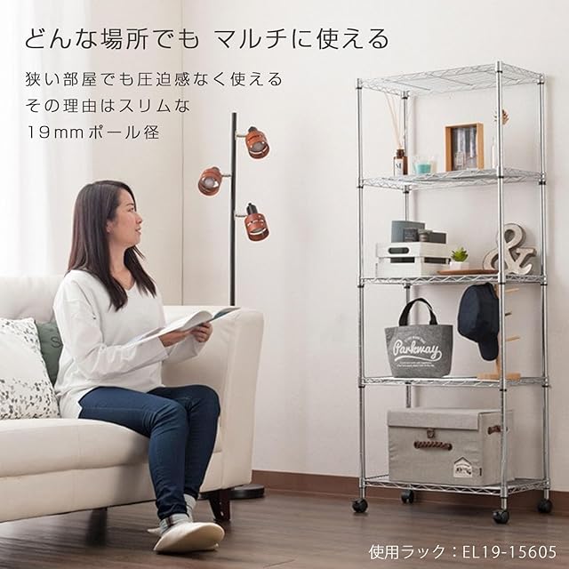ドウシシャ ルミナス互換 システムワイヤーシェルフ 幅75 5段 スリムスチールラック 収納棚 幅74.5×奥行34.5×高さ155cm 全体耐荷重400kg 頑丈 キャスター付き 防錆加工 ポール径19mmパーツ対応 キッチン 隙間収納 EL19-15755