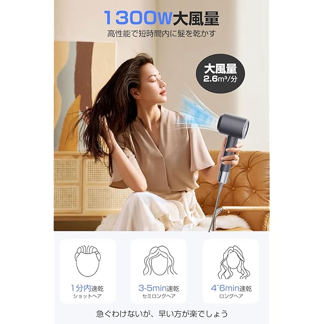 【1300W大風量・本当の速乾】本製品は、純銅製のブラシレス横置きモーターを搭載し、1300Wの大出力を実現しています。これにより、真の意味での大風量による速乾が可能となります。さらに、ヘッド部分には環状風口デザインを採用しており、従来の集中型とは異なり、大面積で風を送ることができます。この設計により、髪へのダメージを大幅に軽減し、同時に広範囲の髪を一度に乾かすことができます。その結果、全体的なスタイリングがより自然な仕上がりになります。朝の通勤前のスタイリングや、洗髪後の乾燥など、どちらも簡単にお使いいただけます。【ご注意:商品は電源を入れてからパワーオンにする必要があります。】