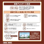 原材料:穀類(米粉、米、米ぬか)、魚介類(フィッシュミール、サーモンミール、フィッシュエキス)、油脂類(動物性油脂、ライスファットカルシウム、フィッシュオイル:DHA・EPA源)、セルロース、種実類(ゴマ粉末)、糖類(フラクトオリゴ糖)、グルタチオン酵母、シャンピニオンエキス、ビタミン類(A、E、K3、B1、B2、パントテン酸、ナイアシン、B6、葉酸、ビオチン、B12、C、コリン)、ミネラル類(カルシウム、リン、カリウム、塩素、鉄、コバルト、銅、マンガン、亜鉛アミノ酸複合体、亜鉛、ヨウ素)、酸化防止剤(ローズマリー抽出物、ミックストコフェロール)