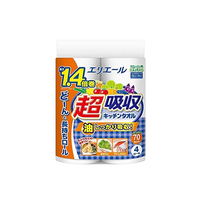 エリエール キッチンペーパー 超吸収 キッチンタオル 70カット×48ロール(4ロール×12パック) パルプ100% 1.4倍巻き 【ケース販売】