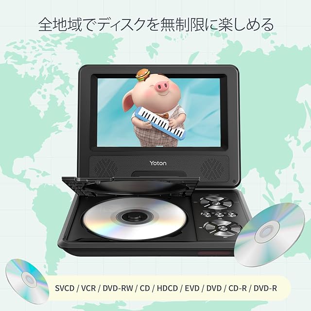 YOTON 9.5インチ ポータブルDVDプレーヤー、7.5インチ回転ディスプレイ搭載、車載・子供向け、バッテリー内蔵で連続4〜6時間使用可能、ヘッドフォン端子、AV-IN/AV-OUT/USB/SDカード対応 【Blu-ray非対応】