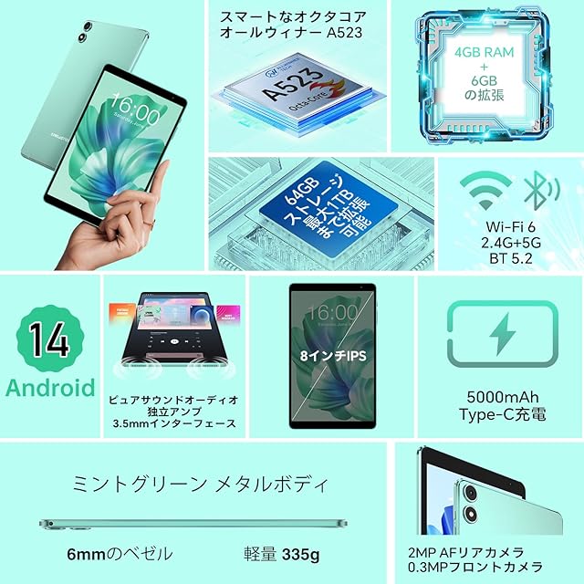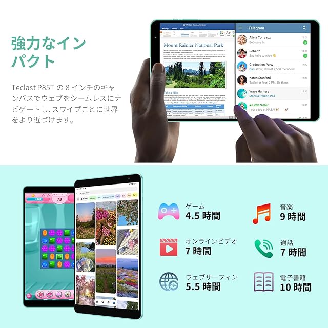 ❤【タブレット 8インチ wi-fiモデル-10GB+64GB+1TB拡張&1.8Ghz 8コアCPU+5000mAh】TECLAST P85T アンドロイド タブレットにはには4GBのRAMに加え6GB仮想RAMをサポート、10GB大容量RAMを用いて、よりスムーズに操作できます。64GBの内蔵ストレージが加え、最大1TBまでのマイクロSDカード(FAT32形式/別売り)の拡張可能なストレージにより、プレイリスト、写真、読書、音楽、ゲーム、映画、オンライン授業、バーチャル学習、テレビ会議、事務作業などなどをストレスなくお楽しみいただけます。8コアのA55アーキテクチャデザインで設計された、新しく導入されたAllwinner A523プロセッサを搭載しています。これは4コアを大幅に強化したもので、A53の6倍以上の性能アップを実現しています。◆P85T android14 タブレットには5000mAhのバッテリーが内蔵されており、大容量で耐久性が高く、サイクル回数が多く、劣化にも強く、一般的なバッテリーよりも安全性が高いです。Type-C+独立した3.5mmヘッドフォンジャックを装備。