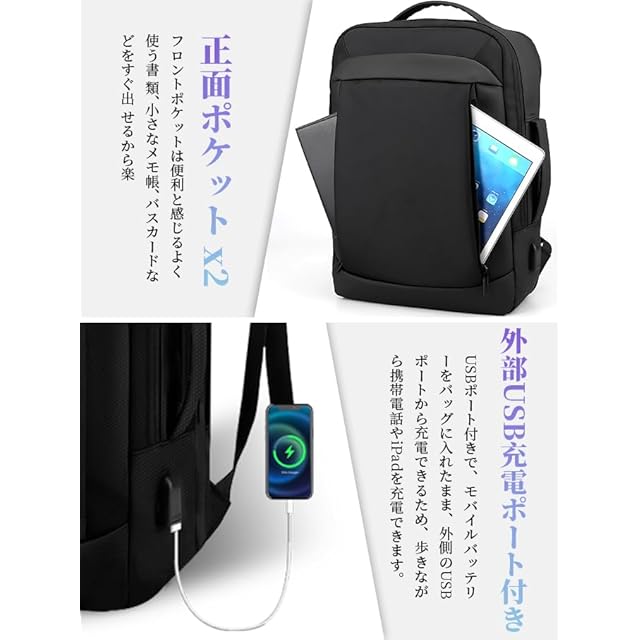 【便利な3 WAY&USB機能】3way バッグ は3WAY仕様(リュック、横手提げ、縦手提げタイプ)、お客様やビジネスパートナーの前でリュックを取り外すと安心できます。さらに重要なのは、ビジネスリュック 大容量 は出張旅行用のスーツケースに掛けることができる専用キャリーオン帯も付いています。リュック 本体はわずか約0.8kgで、気にならない超軽量タイプです。外部USBポートを搭載しています。バックパック 内のモバイルバッテリーと繋げば、背負ったままスマホを充電できます。シンプルなデザインスタイルに落ち着いた色を合わせて、日常のビジネスシーンにぴったりです。大人の魅力を演出してくれます。