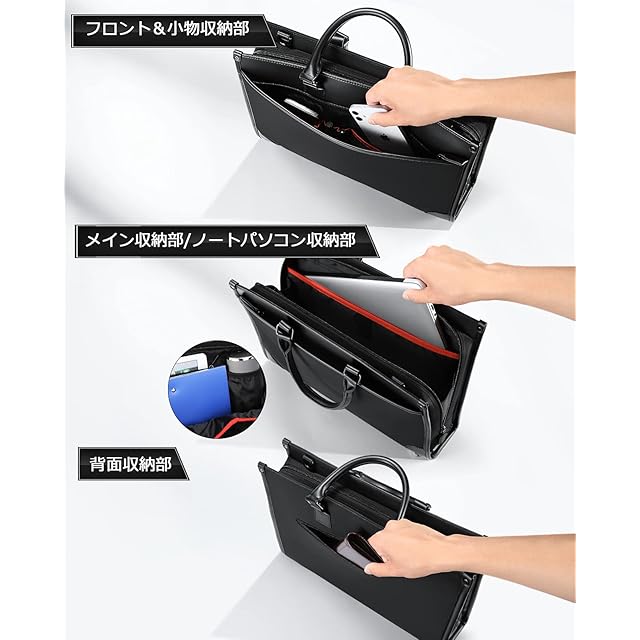 「大容量&収納力抜群」注意:旧バージョンでいただきましたお客様の声をすべて反映して大幅改良しました。(改良点:縫製と検品の改良、丈夫で耐久性もあります。)このビジネスバッグサイズは:縦30cm×横41cm×幅10cm、重さ:1025g。使い勝手がありサイズです。バッグの外側と内側に多くの収納ポケットがあり、書類、会社紹介資料、ペットボトル、折り畳み傘、15.6インチまでのノートパソコン、A4ファイルなどがすべて収納できます。傘専用の収納ポケットがあり、傘やペットボトルを安全に収納できるため、資料やパソコンが濡れる心配もいりません。背面ポケットはファスナー付きなので、貴重品を入れても安心感があります。