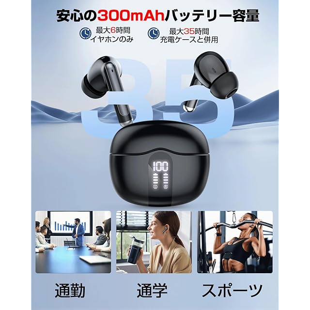 【バッテリー残量一目瞭然&長時間音楽再生】⚡LED残量ディスプレイが付いて、充電ケースのバッテリー残量はLEDディスプレイに100%から1%まで表示され、充電ケースは充電中でLEDディスプレイは自動的に点滅し、充電完了はLEDディスプレイが100%を表示されます。大容量の320mAhリチウム電池を持ち、満充電の状態でイヤホン単体が最大6時間の連続音楽再生が可能です。充電ケースと併せて最大30時間ので、1日中電池切れの心配がありません。Type-Cポートを採用されますので、充電のスピードが従来のUSBより著しく早くなりました。