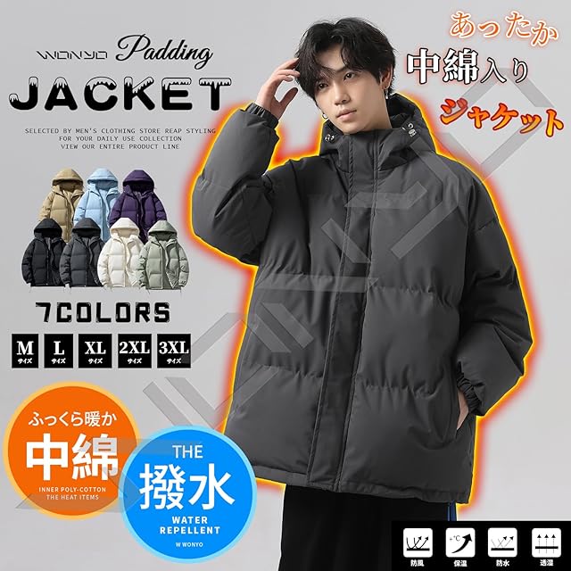 [W Wonyo] 冬服 メンズ 中綿ジャケット 厚手 フード付き アウター 撥水 マウンテンパーカー 冬用 アウトドア 中綿コート 保温 寒さ対策 中綿入り ダウンジャケット あったか 上着 防風 防寒着 定番 無地 ブルゾン 人気 シンプル カジュアル 通勤 通学 お出かけ 冬 purple XL