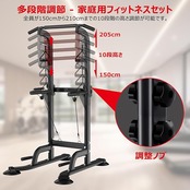 製品サイズ:懸垂マシンの本体重量は約13kgで、ぶら下がりの本体寸法は幅約98cm、奥行き約80cm、高さ約150~205cm(チンニングスタンドの高さは10段階調節可能)です。最大耐荷重は150kgです。