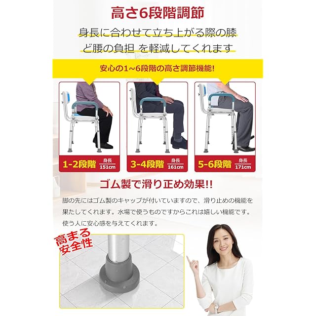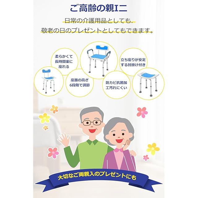 シャワーチェア 6段階高さ調節可能 軽量 丈夫 お風呂椅子 背もたれ付き 取り外し可能 手すり シャワークリップと滑り止めマット付き アルミ合金フレーム 介護ダイニングチェア 転倒防止 ベンチ 立ち上がり補助 入浴用品 日本語説明書付き (肘掛け付き)