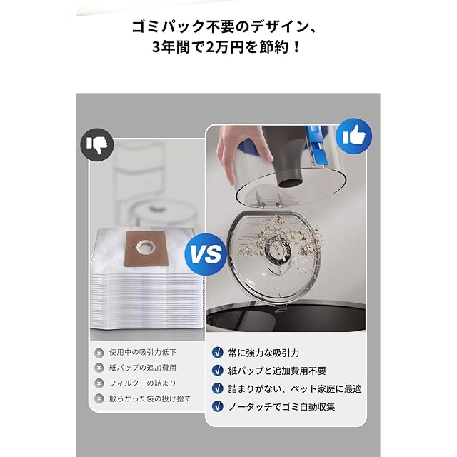 消耗品不要のダストコンテナ設計は、紙パック交換を不要にすることで、コストを節約し、環境への影響を軽減し、持続可能な使用を促進します。さらに、簡単にゴミを捨てれらる機能と視覚化されたコンテナにより、メンテナンスが簡単で、タイムリーにゴミの処理が可能です。