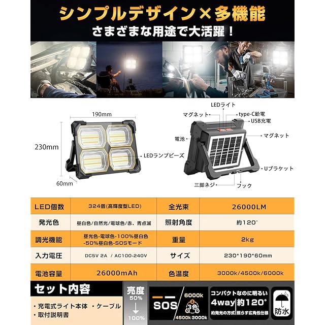 【26000mAh大容量バッテリー・最大25時間連続使用が可能】新世代のLEDライトは使用寿命500,00時間以上に達し、周囲の暗闇を切り開き、夜間であっても昼間のように感じられます。サイズ:Φ230*190*60mm 重量:約2kg(単品) 26000mAh大容量リチウムバッテリーを内蔵しており、電池交換の手間が無し。50%自然色モードで25時間以上、100%自然色モードで15時間連続使用可能!フル充電後、最大約25時間の連続稼働ができます(乾電池次第)。また、USB充電式なので、ACアダプター、モバイルバッテリーなどを利用し、手軽に充電ができます。充電して何回も使える充電式は、環境への 負荷を抑えることができるからです。充電式 led投光器としては、どこでも楽々で持ち運びやすくて、充電が長持ちで週末一泊二日のアウトドア用も安心して使えます。注意事項:ご使用前に完全に充電してください。