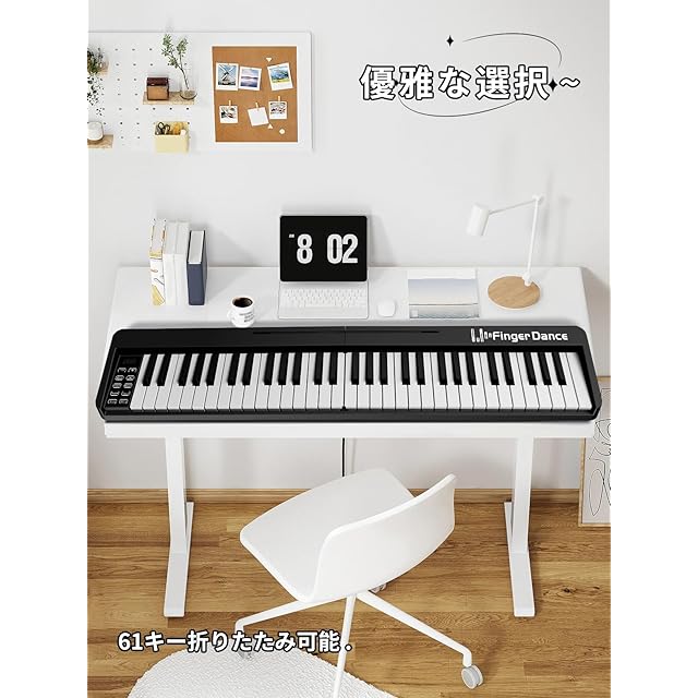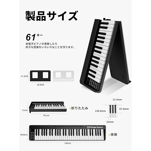 finger danceの最軽の電子ピアノ。クラシックな白黒配色を採用した木目調キーボード。琴身は安全なabs素材を使用しており、軽い。ピアノは折りたたむことができ、収納しやすい。さらに高音質音源チップを採用し、グランドピアノの音質を復元します。