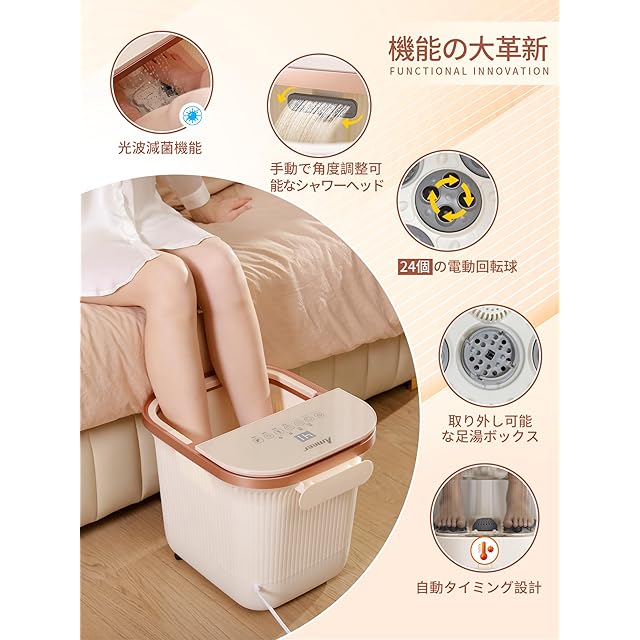 【2024年の大幅な機能アップデート】①4つのスマートモードをワンタッチで設定可能(標準、パワフル、リラックス、睡眠)②底部の電動回転ボールは24個にもアップグレードされ、上部にはシャワー設定が追加され、着脱可能な入浴剤ボックスが嵌め込まれ、自宅でも温泉に入っているかのようなリラックスタイムを演出できます③温度表示/調節/保温機能、35-48℃の温度範囲をお選びいただけ、設定温度に到達すると自動で保温します④時刻表示/調節/自動電源OFF機能、10-60分で自動電源OFFを設定可能で、快適で安心です⑤一体型のミラータッチパネル、ワンタッチでの操作でより使いやすく安全にお使いいただけます。