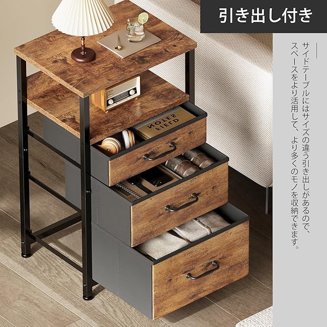 【収納力】天板が二重になっているので、手に取るものが多くなり、収納スペースが増えました。引き出しが三つあるので、あまり使わない物や小物を入れることができます。ホコリを防ぐだけでなく、雑多に見えません。配色は様々なシーンに適しています。サイドテーブル、ソファーテーブル、オフィスキャビネットなどに使うことができます。