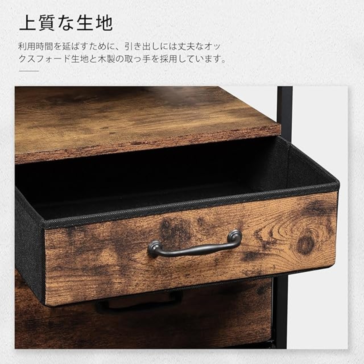 【製品パラメータ】■ファブリックチェスト本体サイズ:幅40奥行29.8高さ68.5cm ;重さ:5.35kg ■天板材質:MDF(E1級合成樹脂強化板) 厚さ:15mm ;■引き出し生地:オクスフォードとMDF ;■取っ手材質:天然木 ■フレーム材質:15mmのスチール