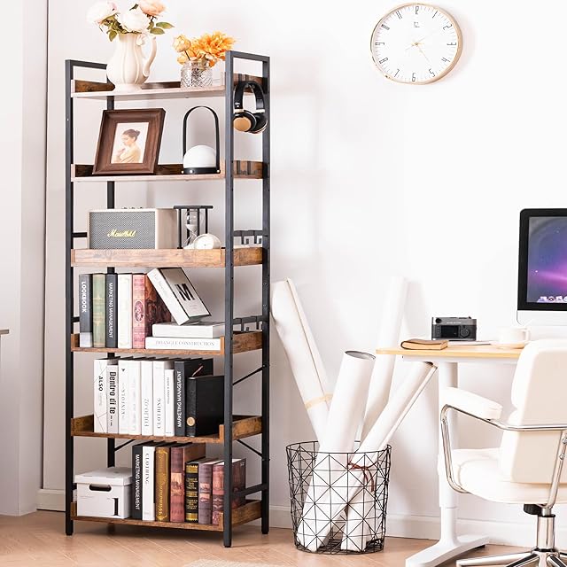 【サイズと調節性】このインダストリアルな本棚は、奥行30cm、幅60cm、高さ178cmのサイズで、各棚の高さ31cmが標準です。中央の棚は調節可能で、アイテムのサイズに合わせて自由にカスタマイズできます。