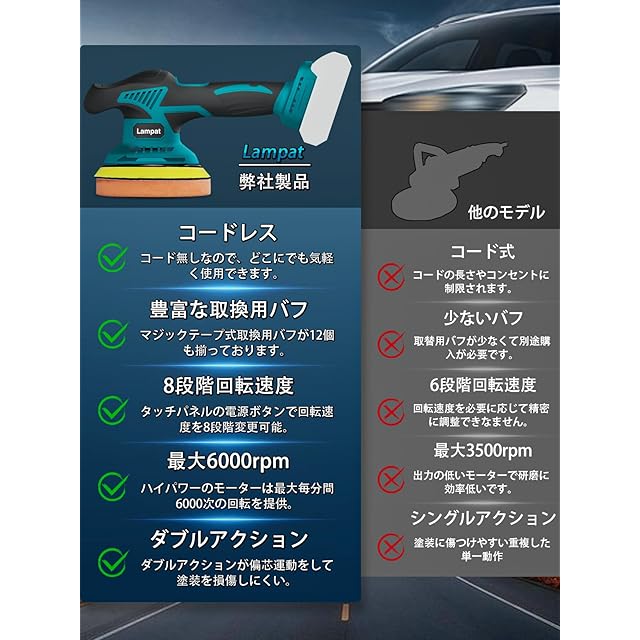 Lampat ポリッシャー 車 ダブルアクション コードレス 電動ポリッシャー 充電式 8段階変速 150mm裏板 6000-2500RPM 強力モーター 過熱防止機能 バッテリー残量表示 偏心構造 ワックス掛け 艶出し 車磨き 鏡面磨き 錆落し ランダムオービットサンダ 家庭用 研磨機 ポリッシャー マキタ 18Vバッテリー対応可能 【本体のみ・バッテリーと充電器別売】 日本語取扱説明書
