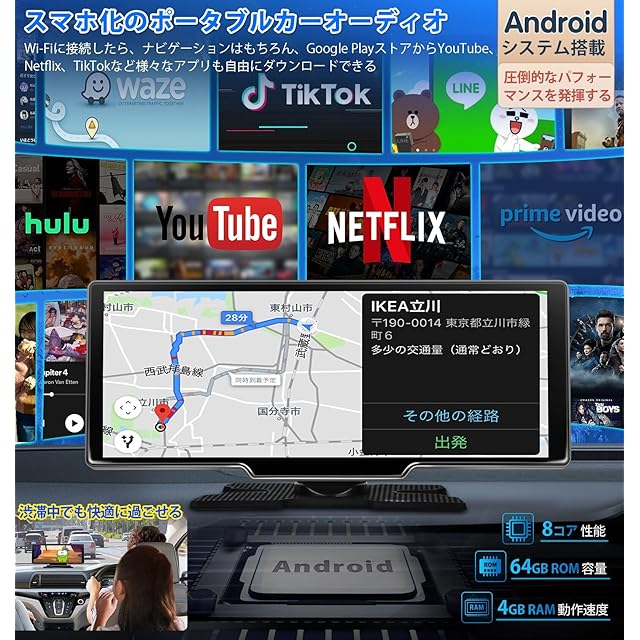 【KASUVAR2024アンドロイドシステム搭載のポータブルディスプレイオーディオ!8コアCPU+4GB RAM+64GB ROM大容量ストレージ 新世代のドライブを体験】Wi-Fiを接続したらいつも最新のオンライン地図はもちろん、スマホでよく使っているエンタテインメントアプリをGoogle Playストアから本製品にインストールできます。YouTube、Netflix、Prime Videoの動画を10.26インチのオンダッシュモニターに楽しめましょう。高速な処理能力と卓越の性能を備えた8コアCPU搭載し、複数のアプリを同時に起動してもスムーズに動作できます。4GB RAM+64GB ROM大容量で、ストレージを気にせずに好きなアプリを自由にダウンロードする可能です。笑顔あふれるドライブへ!ご注意:ストレージが不足になるとアプリが正常に動作しなくなる場合がございますので、定期的に不必要なアプリやデータを削除して空き容量を確保してください。Wi-Fi/ホットポテトの通信速度と電波の強度によって、動作も遅くなる場合がございます。あらかじめご了承ください。
