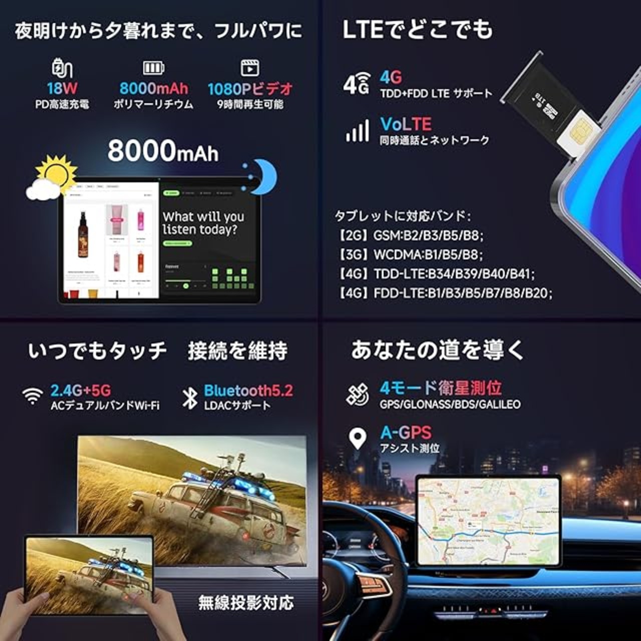 【付き・軽量メタルボディ・児童守護・画面分・/技適認証取得済み・年安心品質保証】タブレットにはGPS+Beidou+Galileo+Glonassの四位一体の衛星位置システムをサポートし、世界中で死角のないナビゲーションを実現します。耐久性に優れた堅牢なメタルボディを採用し、ベゼルはわずか7.6mm、重量はわずか500gです、外出時の持ち運びに最適。デジタル健康と保護者による使用制限制で、お子供様はどのようにタブレットを使っているか、利用状況を分析、コントロールして、教育とエンターテインメントをバランスを取ることができます。本商品は、無線機器電波法令の技適マークとGMS認証も取得しております。デュアルMICマイク内蔵、画面分割と画面記録に対応、PSE、CE、FCC & TELEC 認証取得。☆安*心保*証☆全て1年の限定保*証付き。