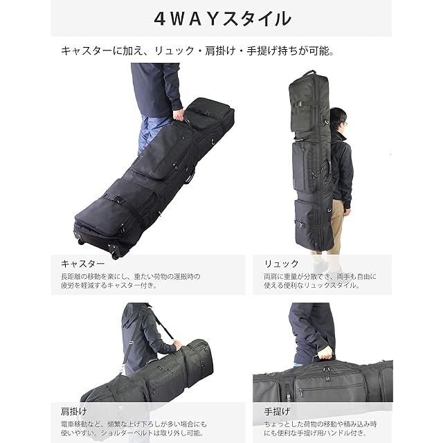キャスター付きモデル<br> <br> ■収納可能ボードサイズ<br> Sサイズ(150cmタイプ):150cmまで<br> Lサイズ(160cmタイプ):150~160cmまで<br> <br> ※サイズ選択のワンポイント<br> 150cm以下の板をお使いの場合でも160cmタイプでも収納はできますが、背負って移動する場合に足が引っかかりやすくなりますので、ご注意いただく必要がございます。<br> <br> ■板を収納する際には、必ずソールカバー装着して収納してください。<br> 鋭いエッジにより、ボードケースの底が磨り減るのをソールカバーにより保護をお願いします。