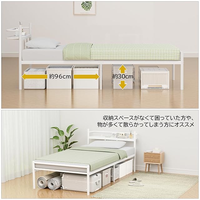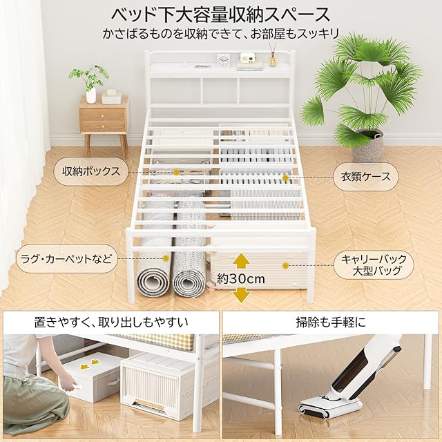 【ベッド下は大容量収納スペース】ベッド下約30cmのスペースがありますので、収納スペ-スとして空間を有効活用できるシングルベッド フレームです。寝具や雑物などの様々なものを収納することができます。部屋が狭い方や荷物が多い方におすすめです。また、高さのある設計のため、掃除機やロボット掃除機などを自由に出入りさせることができて、日常掃除もとても便利です。