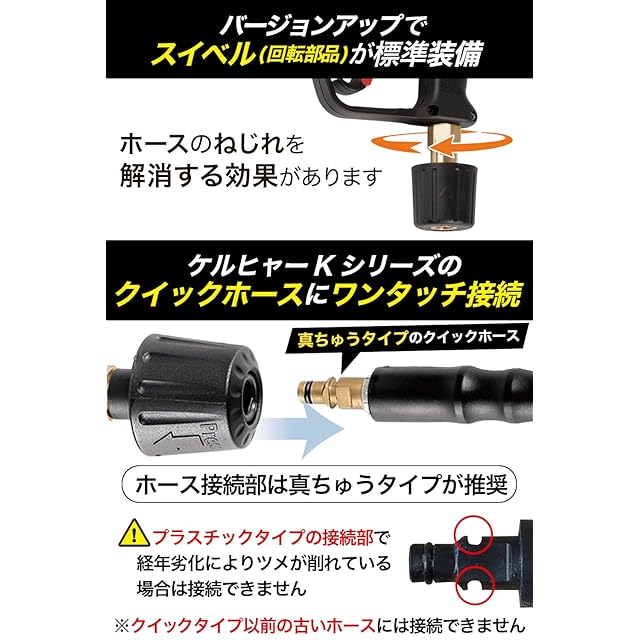 新登場!MJJCショートガンPRO✨バージョンアップでスイベルが付属しました✨MJJCフォームガンと組合せて使用すれば泡洗車が楽になる♪こちらの製品は、ケルヒャーKシリーズ高圧洗浄機の「クイックコネクトホース」に対応したショートガンです。(✅クイックコネクト接続部が「真ちゅうタイプ」のホースでの使用を推奨。【注意】クイックコネクト接続部が「プラスチックタイプ」の場合、経年劣化によりツメ(凹凸)が削れている場合は接続できません。クイックコネクト採用前の古い機種のホースには接続不可。OC3、KHB5、業務用HDシリーズは接続不可。)