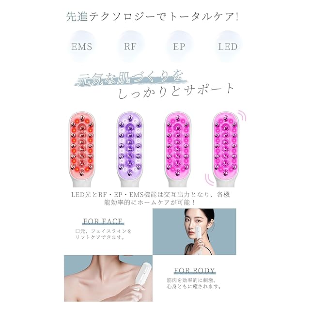 【4 in 1マルチ機能・一台多用】この電気ブラシにはには低周波EMSで頭皮・顔・デコルテを刺激できる電動頭皮ブラシ。12本の電極歯を搭載しています。電源を入れると、ブラシのEMS、RF、EP、LEDの各機能が同時に作動します。 微電流+温熱+浸透が連動し、より効率的に肌をトリートメントします。さらに、赤色LEDと紫色LEDの2種類の光波を搭載。お肌の状態により相応しいLEDモードをお選びいただけ、肌・頭皮のトラブルにアプローチして、爽やかな頭皮とハリ・つやに満ちた顔に! ※初めて使用する際にはレベル1から使用することをおすすめします。必要に応じてレベルを調整してください。