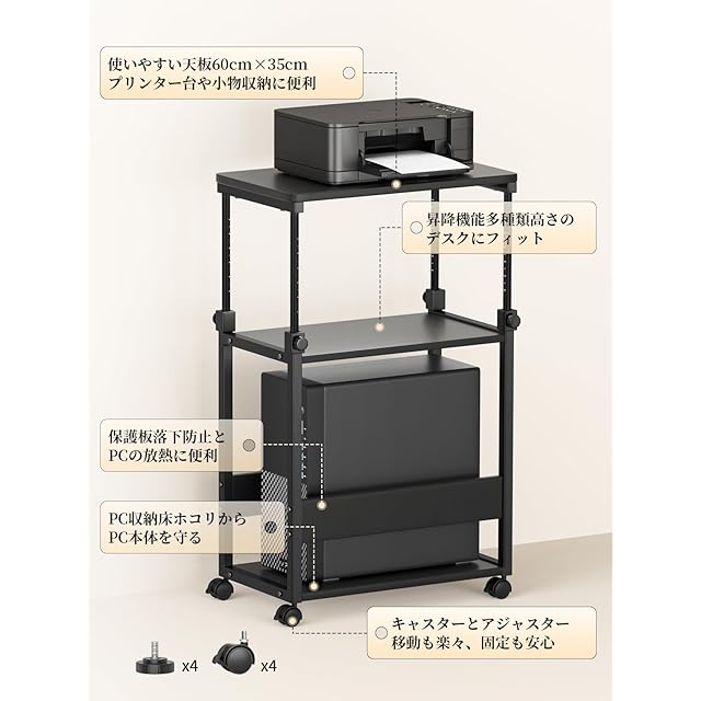【幅35×奥行60×高さ67.5~95cm】パソコンワゴン 昇降式 PCゲーミング cpuスタンド TTWO パソコンラック サイドワゴン デスクトップpc 置き台 複合機ワゴン PCラック サイドデスク・L字デスク・プリンター台 デスクワゴン ディスプレイワゴン アジャスター・キャスター付き (ブラック)