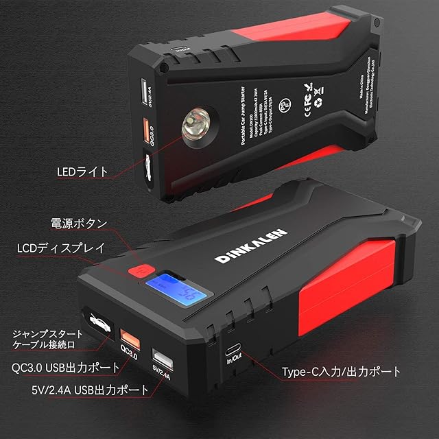 DINKALEN ジャンプスターター 12V車用 エンジンスターター QC3.0充電 12800mAh ピーク電流800A ポータブル 緊急ライト搭載 スマホ急速充電器 日本語取扱説明書
