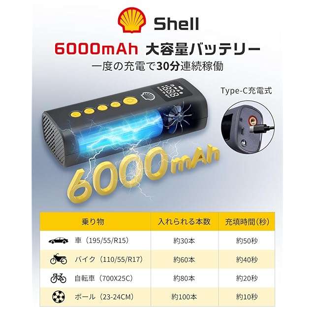 【6000mAhの大容量 & 10秒で充填】Shell 電動空気入れ は6000mAhの大容量バッテリーを搭載しており、3時間でフル充電されます。 フル充電で、自転車用タイヤに80回、バイク用タイヤに60回、自動車用タイヤに30回、バスケットボール用タイヤに100回空気を入れることができます。20L/min空気入れて効率が従来の電動空気入れより8倍も上がり、ボールを10秒で、自転車は30秒で充填できます。 自転車、バイク、ボール、車のタイヤなど、さまざまな空気充填に適したアクセサリーがあります。