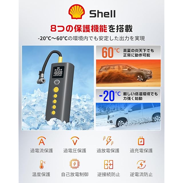 Shell シェル 電動空気入れ 6000mAh 大容量バッテリー 最大圧力150PSI 自転車 空気入れ バイク 車 用 エアコンプレッサー 小型 Type-C 充電式 コードレス 自動停止 低騒音 仏/英/米式バルブ対応 SOS/LED懐中ライト付き エアポンプ モバイルコンプレッサー AC014