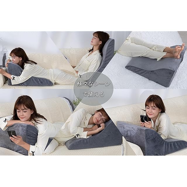 【様々なシーンで活躍する】縦置きと横置きの自由転換により、利用姿勢が豊富になり、足枕や腰枕、背もたれクッションなどとして、様々なシーンで使用できます。また、なだらかな傾斜で肩から支えることにより、首に負担がかからず快適な寝心地を実現でき、普通の枕にはない安定感も実感できます。