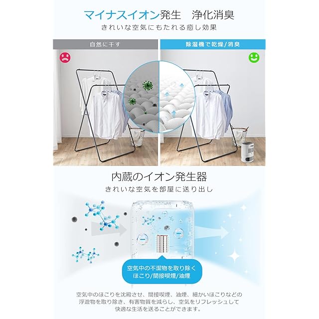 【除湿・空気清浄2in1】空気中のホコリ、花粉などを集じんフィルターによって吸着除去し、除湿しながら清潔な空気を吹き出してくれます。内蔵されたイオン発生器により、マイナスイオンを放出することで、臭いの元やカビなどを分解し、浮遊菌を減少して、部屋干しの生乾き臭を抑え、空気をリフレッシュする空気清浄効果が期待でき、自宅環境の改善に役に立ってくれます。