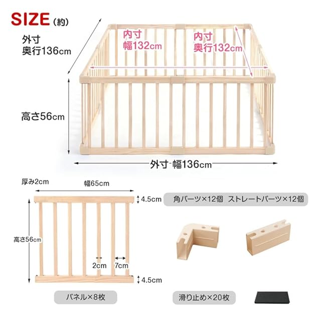 【サイズ】[全パネル8枚を使用したとき]外寸:(約)幅136cm×奥行136cm×高さ56cm / 内寸:(約)幅132cm×奥行132cm×高さ56cm [パネル1枚] / 外寸:(約)幅65×奥行2×高さ56cm 【対象年齢】0〜2歳