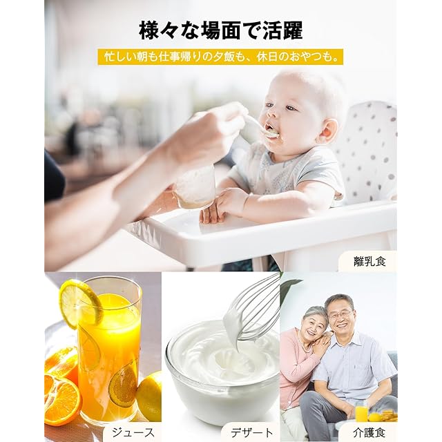 【1台7役、ハンドブレンダーだけでなく...】HAGOOGI ハンドブレンダーの一番の魅力はアタッチメントの種類の豊富さによって、料理初心者でも使いやすく、料理のレパートリーを増やせて献立が豊かになります。作りたいメニューによって、ボタンを押すだけの簡単操作で必要なアタッチメントが変えれば、魔法のように「ハンドブレンダー」、「ブレンダー」、「ハンドミキサー」、「ミキサー」、「フードプロセッサー」、「泡立て器」様々な調理器具に変身する!製品仕様:充電時「DC5V/2A」を確認してから充電してください。使い方:電源ボタンや無段変速スイッチを同時に押す。