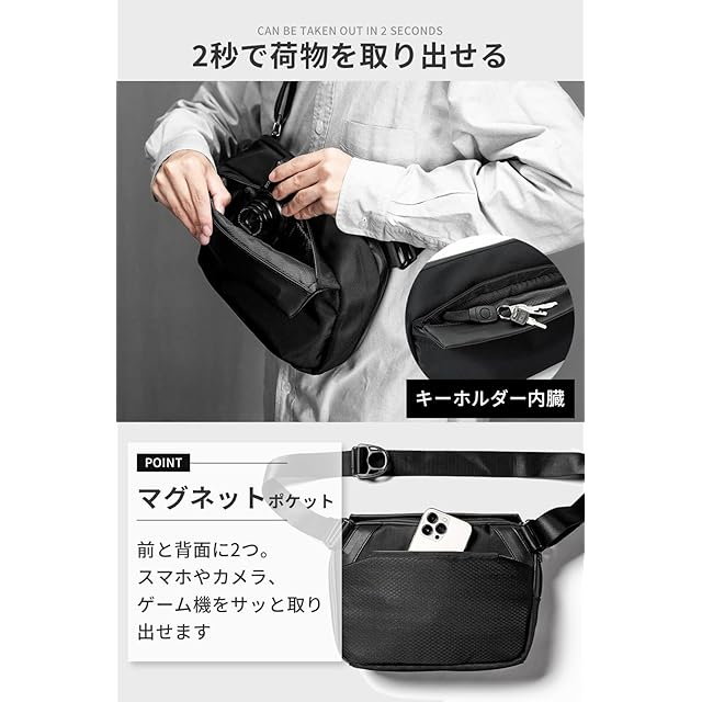 ✅【瞬時にアクセス】 フロントポケットはマグネット式により、瞬時に荷物が取り出せます。趣味、旅行、ビジネスまで「これ1つあれば」を実現した。手ぶら派に最適のショルダーバッグです。