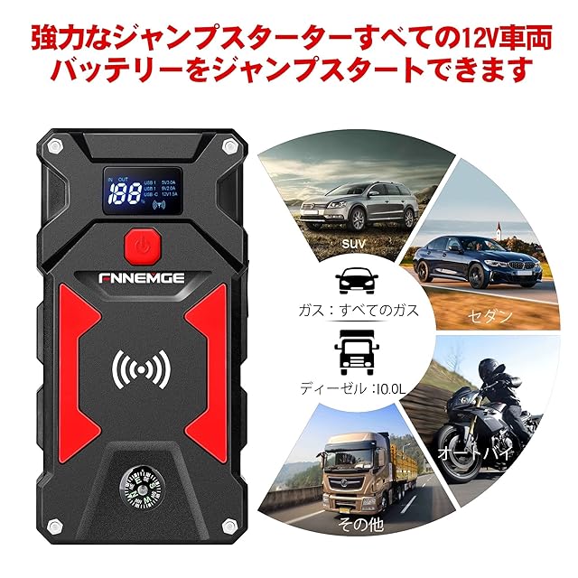 【超大きい容量、強力な起動性能】FNNEMGE ジャンプスターター、ピーク電流6000A、容量26800mAh,12V車(フルガソリン、10リットルディーゼル)を簡単に始動できます,トラック、オートバイ、船、草刈机、ヨット、スノーモービル。二度と通りで立ち往生することはありません,誰かがあなたを助けたり、けん引サービスを要求したりするのを待つ必要はありません, また、グローブボックスやシートの下に収納できるほどコンパクトです。