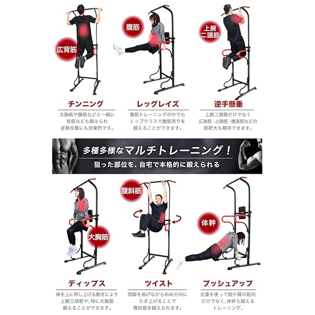 ✅【鍛え方いろいろ】懸垂(チンニング)、プッシュアップ、ディップスなど、さまざまなトレーニングがこれ1台で可能。背筋・上腕三頭筋・腹筋・胸筋・腕・ヒップ・ウエストまで、効率よく鍛えることができます。筋力をアップしたい方はもちろん、運動で汗をかいてリフレッシュしたい方や、健康的で引き締まった体を手に入れたい方にも最適です。ジムに通わず、自宅で本格的なトレーニングを実現できるので、忙しい方でも手軽にトレーニングが続けられます。