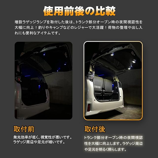 【高輝度&明るさ調整可能】本ラゲッジランプは、超高輝度のLEDチップが搭載し、広範囲を明るく照らし、荷室オープン時の夜間視認性を大幅に向上します!または3段階明るさ機能付き、ボタンを一回押すと明るさが調節可能です。お釣りやキャンプ、夜間作業などに合わせて、簡単に最適な光量に調節することができます。