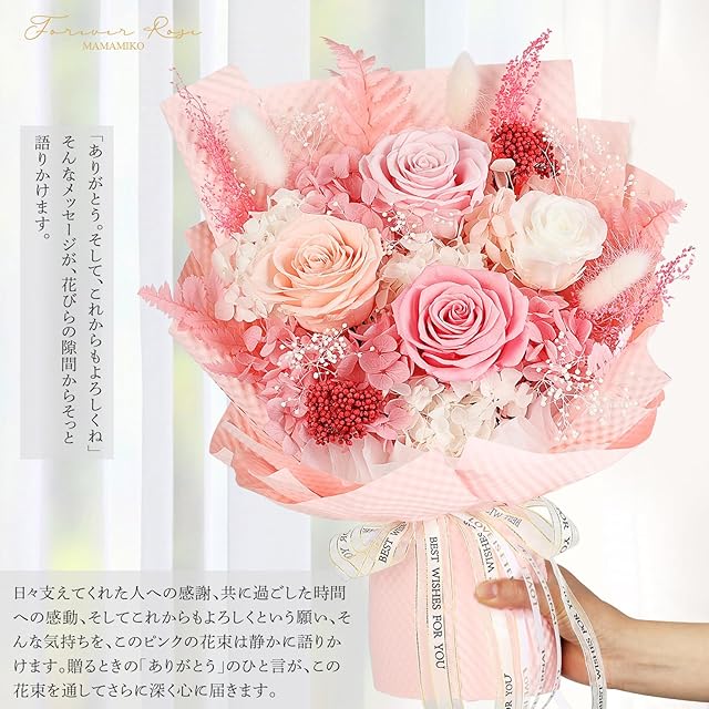 【手入れ不要、3年以上咲き続ける】このピンク色の花束は、日本から発展したプリザーブドフラワー技術を用い、高品質な生花とバラを選んで丁寧に加工されています。生花のように儚く枯れることがなく、3年以上その美しさを保ちます。さらに、水やりやお手入れが不要で、そのまま飾って花の美しさを気軽に楽しむことができます。