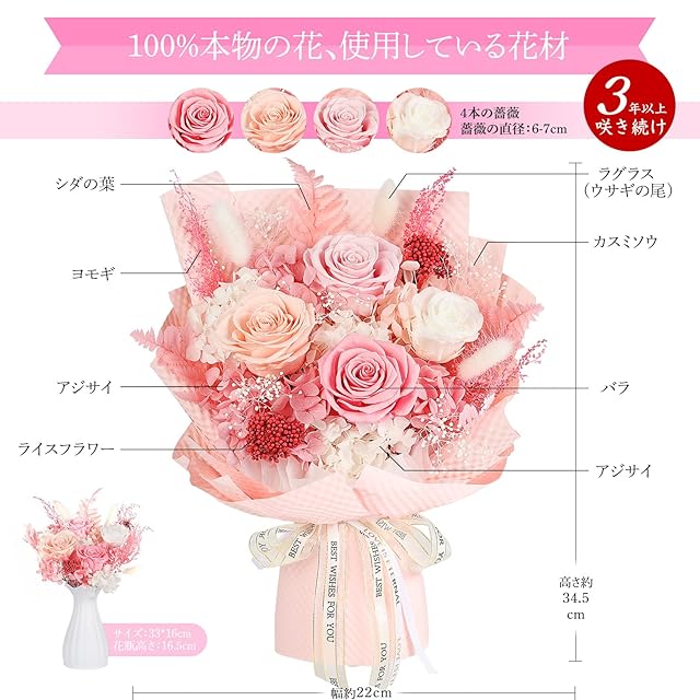 【商品サイズ】薔薇の直径は約6-7cm、花瓶の高さは約16.5cm、花束サイズ(高さ約34.5cm、幅約22cm)、窓付き手提げボックスサイズ(35*21.5*12cm)。