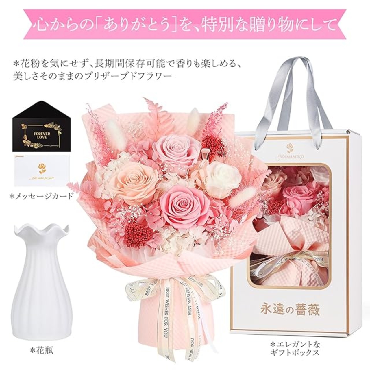 【プレゼントにおすすめ】このプリザーブドフラワーの花束は卒業式、誕生日、記念日、母の日、父の日、結婚記念日、バレンタイン、クリスマス、還暦祝いなど、特別な日に贈るプレゼントとして最適です。また、花束にはメッセージカードも付属しており、心のこもったメッセージを添えて贈ることができます。窓付き手提げ付きのギフトボックスに入れて、どこでも簡単に持ち運べ、贈る瞬間の感動をそのままに届けることができます。