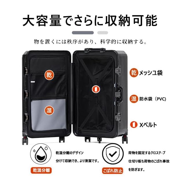 【革新的な3:7の型で スーツケース】収納スペースが、展開すると半分個づつの大きさのキャリーケースと違い、革新的な3:7の型で、深めの半分、ヘルメットや小型炊飯器、靴など、通常のスーツケースには入らない荷物も立てて入れられて、 もう片方に細かいモノを入れたりと、スッキリと収納が出来ます。インナーカバーがありますが、はずせばギリギリまで荷物を詰められます。乾湿分離のデザイン、分けて収納でき、よりきれいです。荷物の出し入れも便利に行えます。