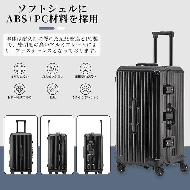 【材質&TSAダイヤル式ロック】スースケースはPC素材を採用し、耐衝撃性に優れた上、高弾性で、変形しにくい。エンボス加工、傷つきにくい。ABS素材より頑丈で耐久性に優れ、アルミフレームスーツケースより軽量で持ち歩きやすい。TSAダイヤル式ロックが搭載されて、外出がより安全。【※注】また、鍵穴は航空会社検査専用の物です。本製品に鍵は付属しておりません。