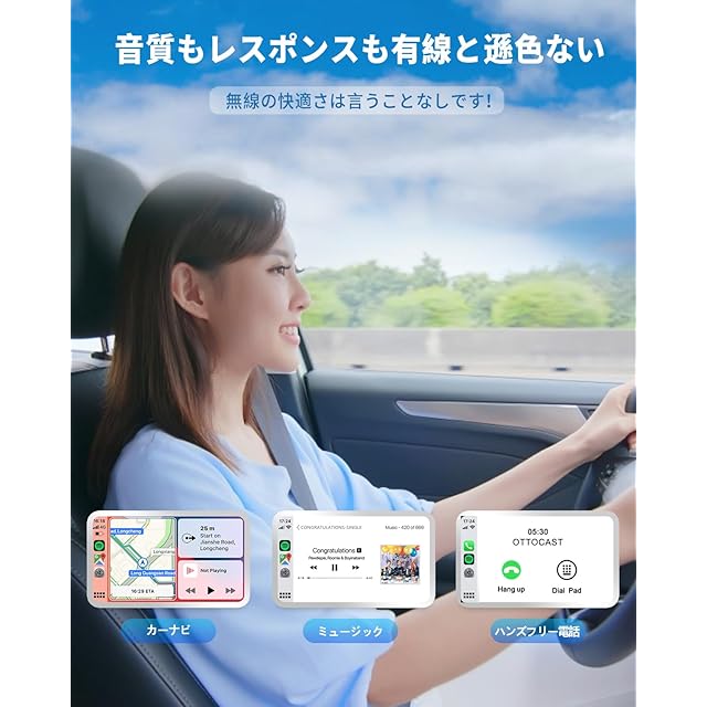 【CarPlayを無線化して更に快適に】このワイヤレスカープレイドングルはiPhone6およびそれ以降のiPhoneモデルで動作できます(iOS10以降)。Apple Map、Google Map、Yahoo!カーナビ、カーナビタイム等自分の好きなマップアプリを選べたり、自分のお気に入りの音楽でより快適なドライブをサポートできます。また、タッチパネルの操作も連動され、使いやすいです。音声で操作可能で、メッセージを読まないで聞く書かないで話す、伝えたい内容を話すだけなので、運転に集中できます。Bluetoothハンズフリー通話ができ、目を離さずに電話できて、運転中でも安心です!