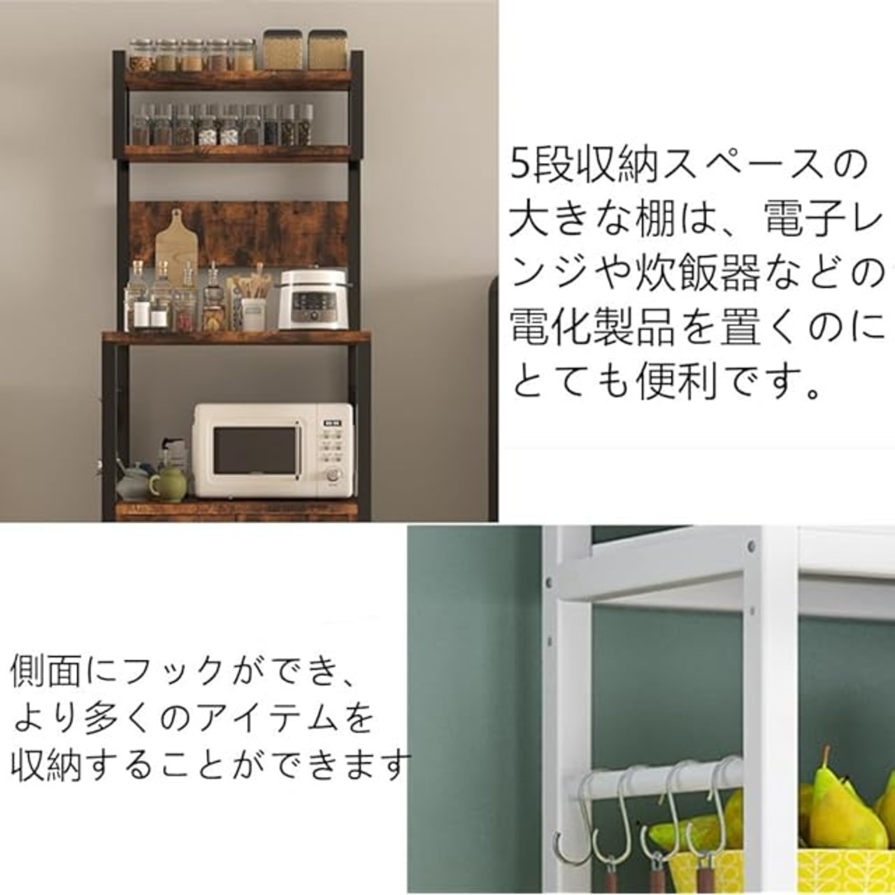 【多用途】5段収納スペースの大きな棚は、電子レンジや炊飯器などの電化製品を置くのにとても便利です。手頃な高さで物を取りやすく、キッチンだけでなくリビングにも置くことができます。