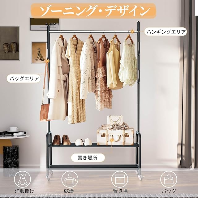 【多機能収納】:一台多役!多くの洋服だけでなく、バッグや帽子なども掛けられるし、下部にある棚には靴やスーツケースも置けます。