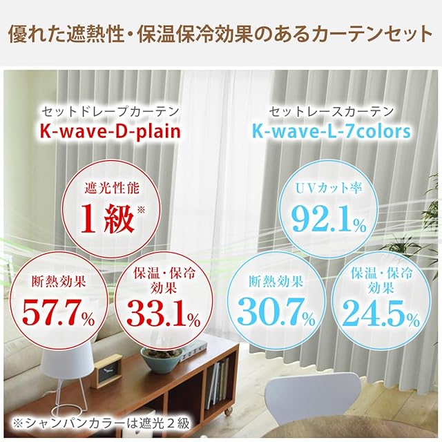 縫製:1.5倍ヒダ/ 2ッ山 /形態安定加工 組成:ポリエステル100% フック:(K-wave-D-plain)アジャスターフック付き(標準Aフック仕様) (K-wave-L-7colors)アジャスターフック付き(標準Aフック仕様) 機能:(K-wave-D-plain)遮光2級 / 防炎 / 形態安定加工 / ウォッシャブル(洗濯可) (K-wave-L-7colors)UVカット約92.1%カット / 昼夜目隠し / 断熱効果30.7% / 保冷・保温効果24.5% / 防炎 / 形態安定加工 / ウォッシャブル(洗濯可) ※幅サイズ、125cm・150cm・200cmの商品については必ず生地と生地のつなぎ目が入ります(幅継ぎ) 幅継ぎについて・・・こちらの商品は幅150cmの生地を用いて1.5倍ヒダで製作しているため、幅が100cmを超えるカーテンを製作する際には2枚の生地を継いでの製作となり、生地と生地のつなぎ目が入りますこと、予めご了承のうえご検討をお願い致します。