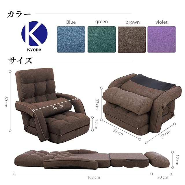 【角度調節機能】:KyoDa 14段階角度の調節可能な3way座椅子です。日本メーカー「KOYO」製のギアが使用されています。背もたれは14段階リクライニングが可能で、お好みに合わせた微妙な角度調整ができます。姿勢の変化や体格差に応じた最適なサポートを実現します、10000回の耐久テストに合格し、長くご愛用いただけます折り畳んで、スペースを節約することができて、読書やTVの視聴、横になっての昼寝等、くつろぎ方は自由自在。また、こだわり肘置きでアームがあることで、立ち座りや読書など、日常動作をサポート。快適度もグンとUPしました。
